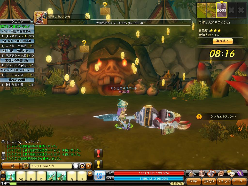クエスト経験値がありがたすぎる。 あと、課金してアバレット回してみたんですが、11回中5個が男用装備で、女装備も足とスカートが2個ダブる 結局使える部位4個というマゾさ ウサ耳つけれたしもうそれでいいや・・・・ PR ・ボスソロ ・クエストこなし ・野良PTでボス連戦 ・身内でクエスト手伝い 等やりつつレベル27。 今まで一切説明が無かったんで補足 ・管理会社はネクソン。今のところログインオンラインや鯖缶は見られない。 ・正式サービス初日はキムチパーティだったらしい ・年齢層は多分低い ・ヌルゲーなので地雷プレイは殆ど見かけない(突っ込む前衛と回復しない魔法職くらい?) ・BOTは見かけないが、街中央でのRMT業者の全チャが鬱陶しい ・横殴りは普通 ・2D横スクアクションで操作は十字キーとasdfzxcv、ジョイパッド設定可能 ・基本的には通常MAPでの戦闘か、ミッションモードでの殲滅&ボス戦、それに伴ったクエスト ・クエスト内容はアイテム集め・指定のMOBorBOSS討伐・ミッションクリア、お使い等 ・MAPの要所要所にポタがある・街で自動回復の速度が上がるのでお座りや移動に時間が掛からない ・レベル2~3ごとに新しいMAPへいけるので新鮮 ・MAXで4人PT ・スキル制で、ステータスは自動配分、スキル振替えにリアルマネーが掛からない ・上記より、一度作った職は作り替える必要が無い ・職ごとの育成難易度の差が激しい ・武器防具は過剰・特殊効果付与が可能だけどもちろん失敗するし確立はお察し 職業体感 弓使い 自分で使ってる職。ボスソロ可能で火力もHITも高いがスキルディレイ中に囲まれると即死。 PTプレイでは後衛で固定砲台になればメイン火力だけど前衛居なかったら逃げ回る紙くず 剣士 前衛職その1。1:1で殴り合いか複数相手だとスタンさせてだらだら殴ってる感じ 全体的に敵倒すのに時間かかってる ただしちょっと囲まれたくらいじゃ死なない PTに1人いると凄い楽、でも2人いると討伐時間が目に見えて伸びる 盗賊 空中でダメージ食らわずに広範囲にスキル攻撃 いつもMP枯渇してるイメージ MPpot使ってる時は前衛こなせて火力もある 魔法使い スローヒールがあるだけでBOSS戦がものすごい楽 1PTに1人か2人いると安心 ume見てる限り育たない内はMPが持たない=火力も無い スキル次第で高火力にもなるっぽい 前衛1後衛3(うち魔法職最低1)が理想 そんな感じです。 |